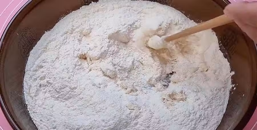 1.400克麵粉放入盆中,加入4克鹽增加麵粉筋性。然後用240毫升水和面。