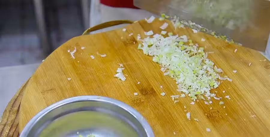 在冷卻的時間,我們準備一下蘸料,生薑一塊,拍扁後,切成細沫,大蔥白,也切成細沫,放在一起備用。