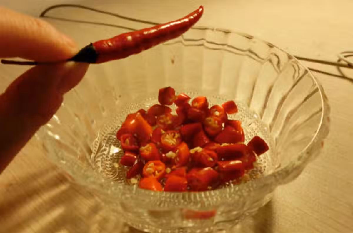 再來做涼拌汁,小米椒洗凈切小圈,青椒切小丁,蒜剝皮拍碎切蒜末,可能有人不太能吃辣,調涼拌汁時直接不放辣椒,這是不對的,記住少放可以,決不能不放,否則味道大不一樣,而且小米椒最好用新鮮的那種,別用曬乾的小米椒,味道有區別,做涼拌菜用新鮮的小米椒味道更好吃。