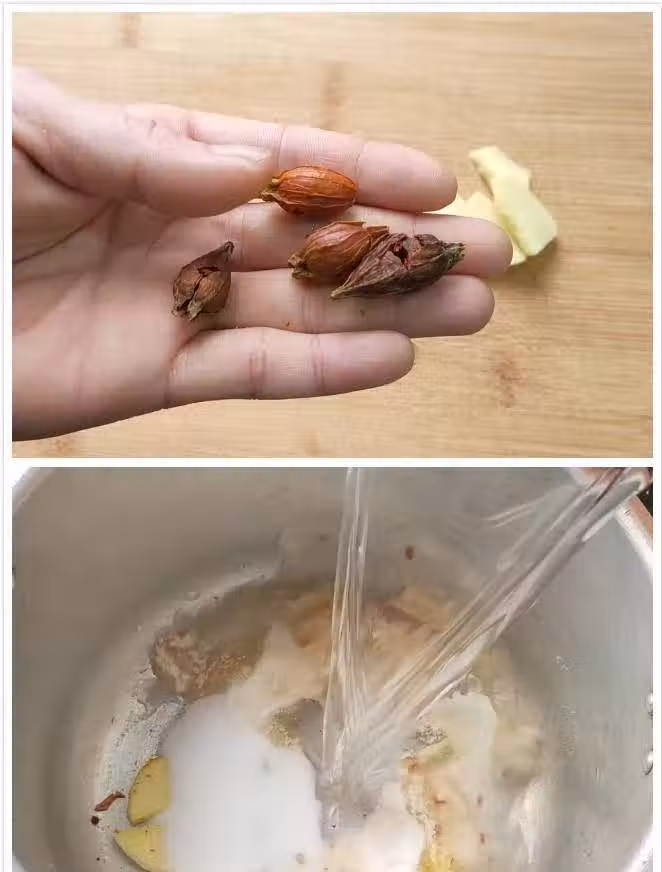 第二步:準備一塊姜,去皮洗凈後切成薑片備用,再準備四個調色用的黃梔子,一般的藥店裡都能找到,用刀把它壓一下壓碎,然後把黃梔子碎和薑片一起倒入深鍋中,再加上30克的鹽焗雞粉,160克的鹽,再倒入六斤左右的清水,鍋要用小一點的,一定要把整雞泡上,先調大火把湯水燒開。