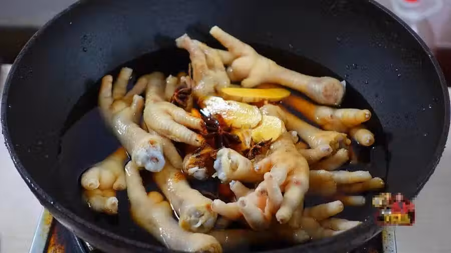 第四步:將清理干凈的雞爪放入鍋中,放入1碗清水,加入50克冰糖,加入半杯醬油,加入1湯匙老抽,再放入5個八角和幾塊薑片,蓋上鍋蓋,大火煮開之後,轉成小火,煮15分鐘!