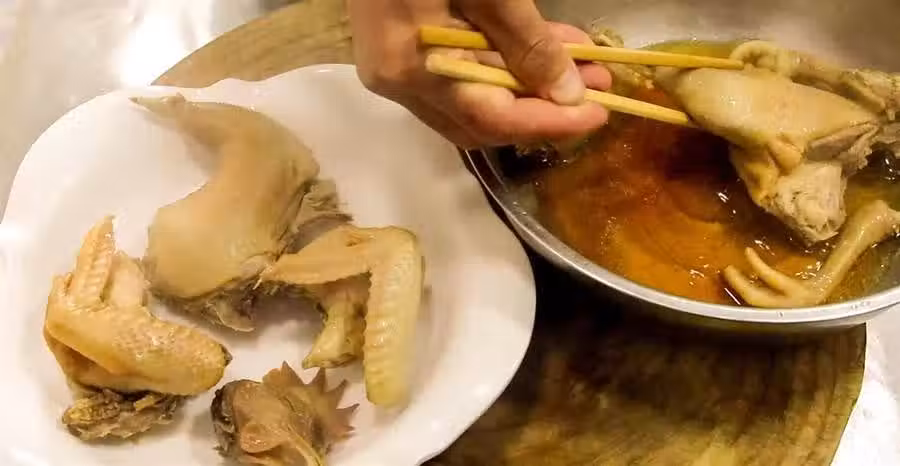 4.40分鐘以後,雞塊已經蒸熟,遍體金黃,把雞塊從鍋中取出,擺放在盤中,再淋入適量料汁就能上桌食用了。