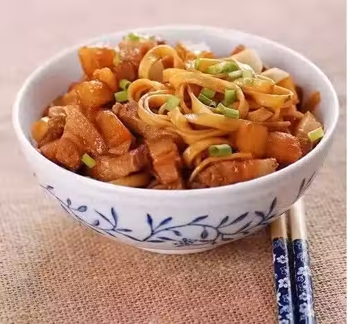 小土豆三個;五花肉200g;鮮壓雞蛋面300g;油2湯匙;蔥;姜幾片;生抽2湯匙;老抽1湯匙;八角2個;鹽少許;大蒜幾瓣