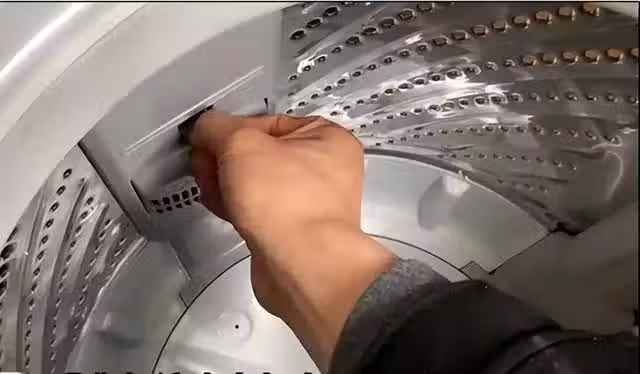 第一個容易藏污納垢的地方就是洗衣機的線屑裝置。把線屑裝置比喻成洗衣機的聚污盒一點都不為過,一般這個裝置位於洗衣機內桶壁上面。找到這個線屑裝置後我們把裝置上的卡扣向下按壓,就能輕鬆把外殼取下。