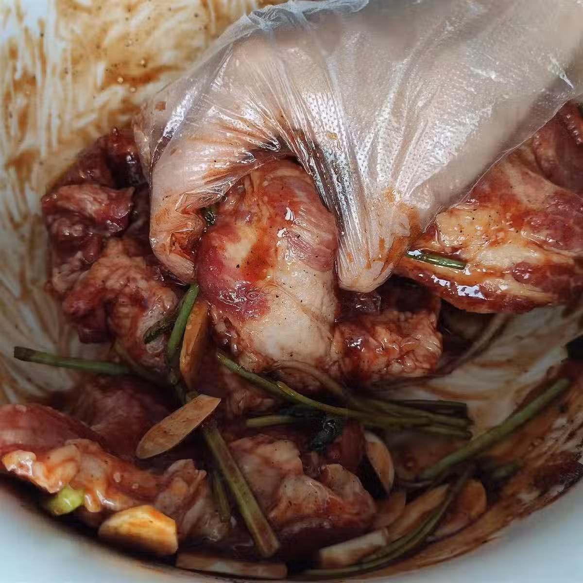 4、蓋上保鮮膜,把抓拌好的冰箱放進梅頭肉里靜置腌制4個小時,讓其充分入味。 (腌制叉燒的時間一定要夠,叉燒才好吃)