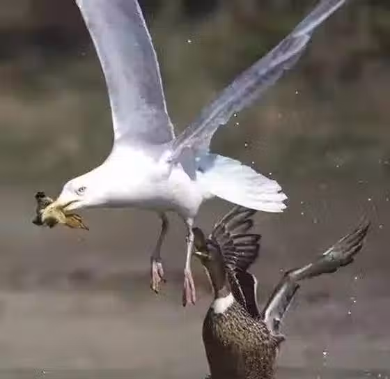 10.海鷗搶奪鴨媽媽的孩子。海鷗是出了名的強盜,它們甚至學會了搶奪人類的食物。