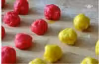 4.分別將紅黃麵糰壓成厚片包入油酥