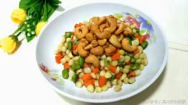 3、起鍋熱少許油,爆香薑末,先倒入胡蘿蔔丁炒至七、八成熟後,再放入玉米粒、腰果、黃瓜丁翻炒,最後用鹽、蘑菇精調味即可。