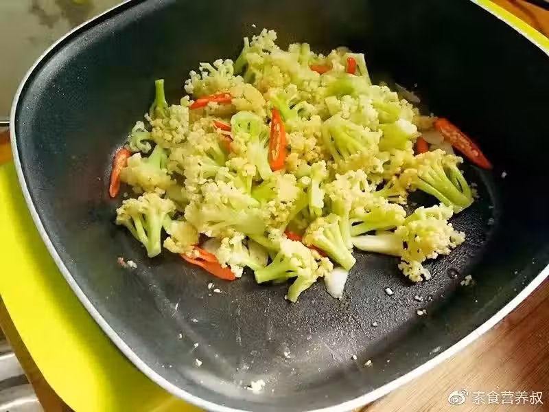 2. 把小米椒切一下。3. 熱鍋涼油,下花菜大火翻炒大約3分鐘。4. 加入生抽、鹽調味,再加入小米椒翻炒均勻即可。