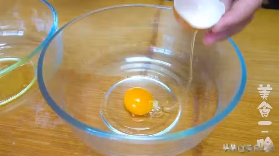 第二步:所有食材都準備充分之後,我們先調一個蛋黃糊。蛋黃糊裡面加上牛奶攪勻,再篩入低筋麵粉,用蛋抽以「Z」字形攪拌成細膩光滑沒有顆粒的糊狀即可。