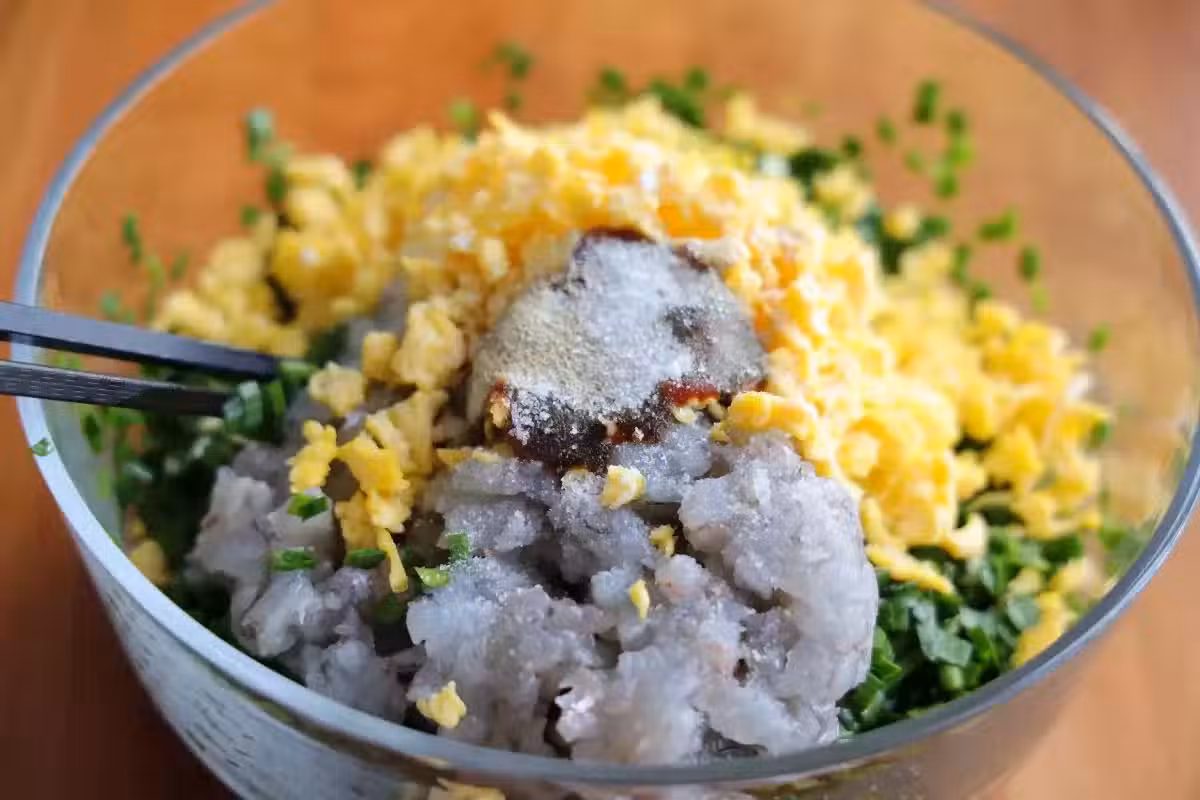 4、再來調味:1勺蚝油、2克胡椒粉、1勺鹽拌均勻,肉餡兒就調好了。
