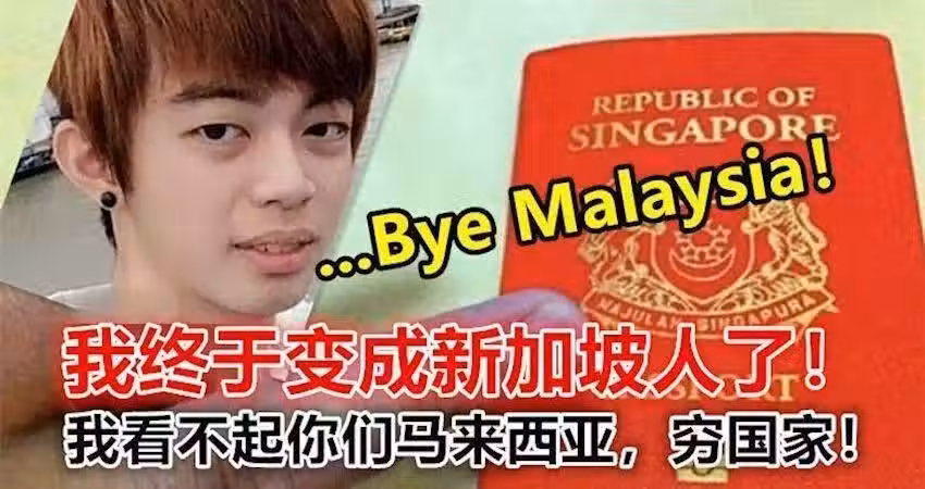 Bye Malaysia! 我終於變成新加坡人了!我看不起你們馬來西亞,窮國家!網友:滾!永遠別回來了!