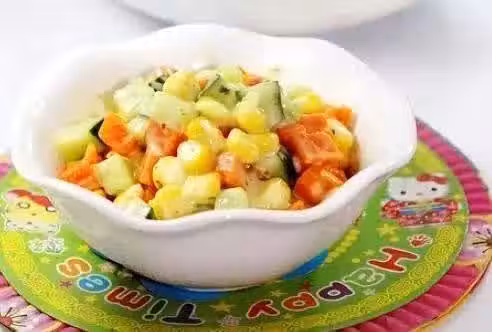 1、胡蘿蔔削皮後切成小丁;黃瓜用鹽刷洗乾淨外皮後去籽切丁;甜玉米剝粒