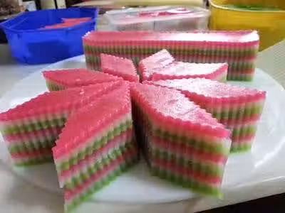 2. 第一層(青)及第二層(白)用中火蒸3分鐘。第三層(紅)及第四層(青)蒸4分鐘。第五層開始蒸5分鐘,順序將其餘的,重複做完。最後一層(紅色可以再加深色點)蒸10分鐘,再開鍋蓋蒸10分鐘即可。(開鍋蓋蒸是要讓糕點表面的水蒸幹掉,表面才不會濕 )待糕完全冷卻才用塑膠刀切塊。