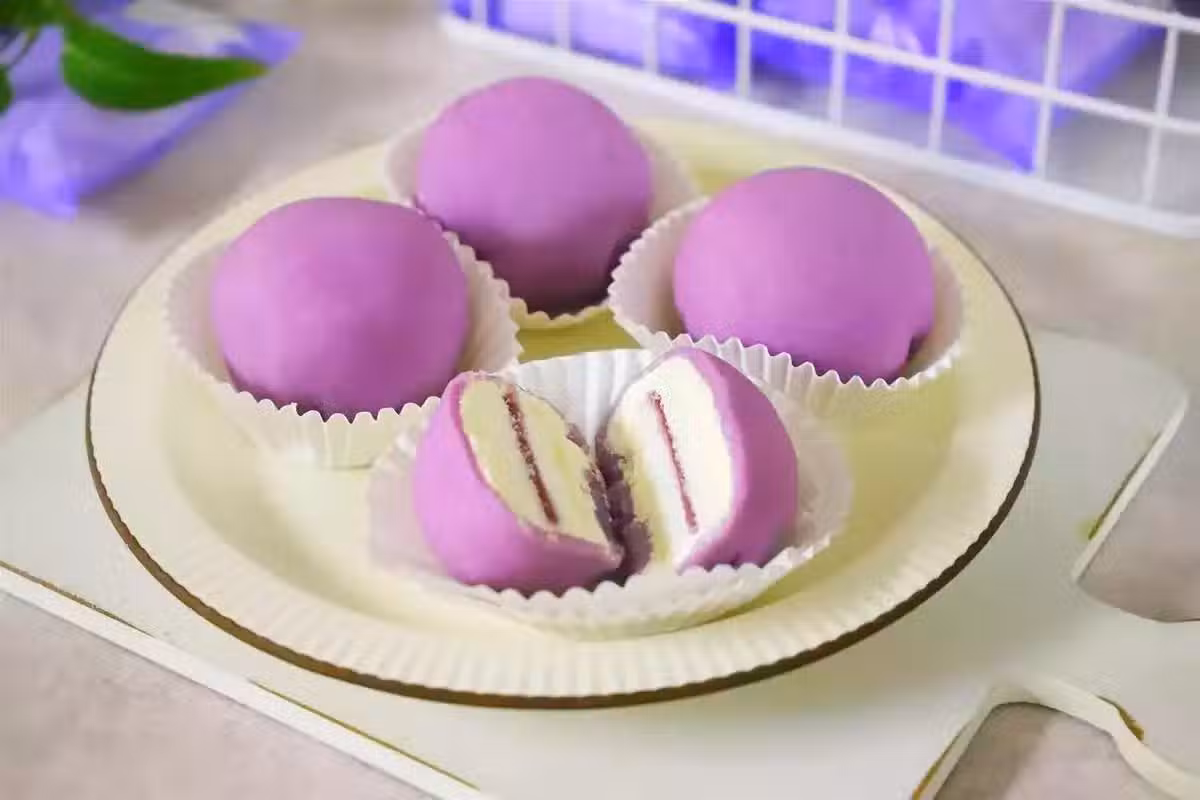 【材料】:冰皮月餅粉100克,紫薯粉3克,開水100克,淡奶油120克,白砂糖10克,紫薯米糕4塊