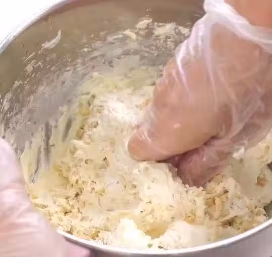 因為在桶里揉會黏住,用刮板將糖鏟下來,轉移到油紙上,繼續揉勻。