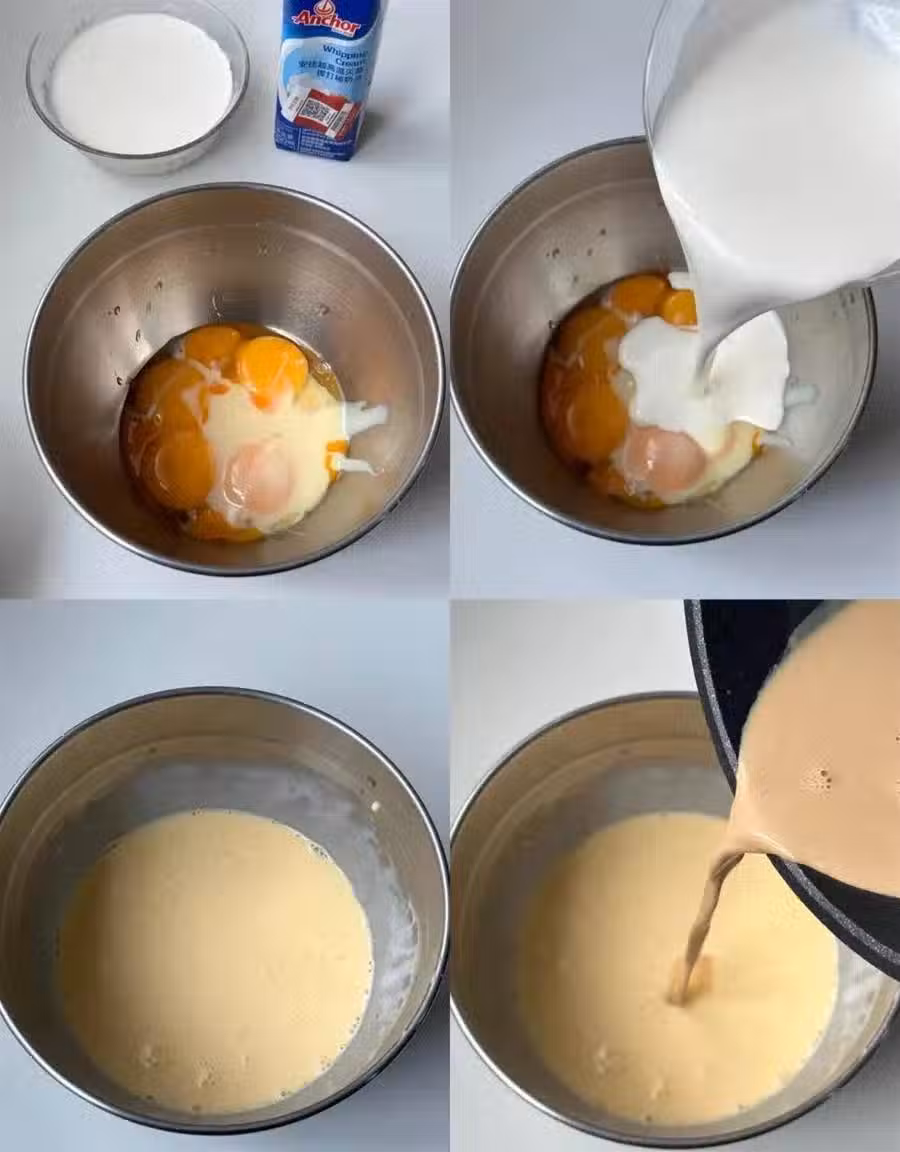 4 / 倒入模具8分滿,烤盤中加熱水,水浴法烘烤,送入預熱好的烤箱,上下火180度烤20分鐘後取出,撒點白砂糖,繼續烤10分鐘至焦糖色。