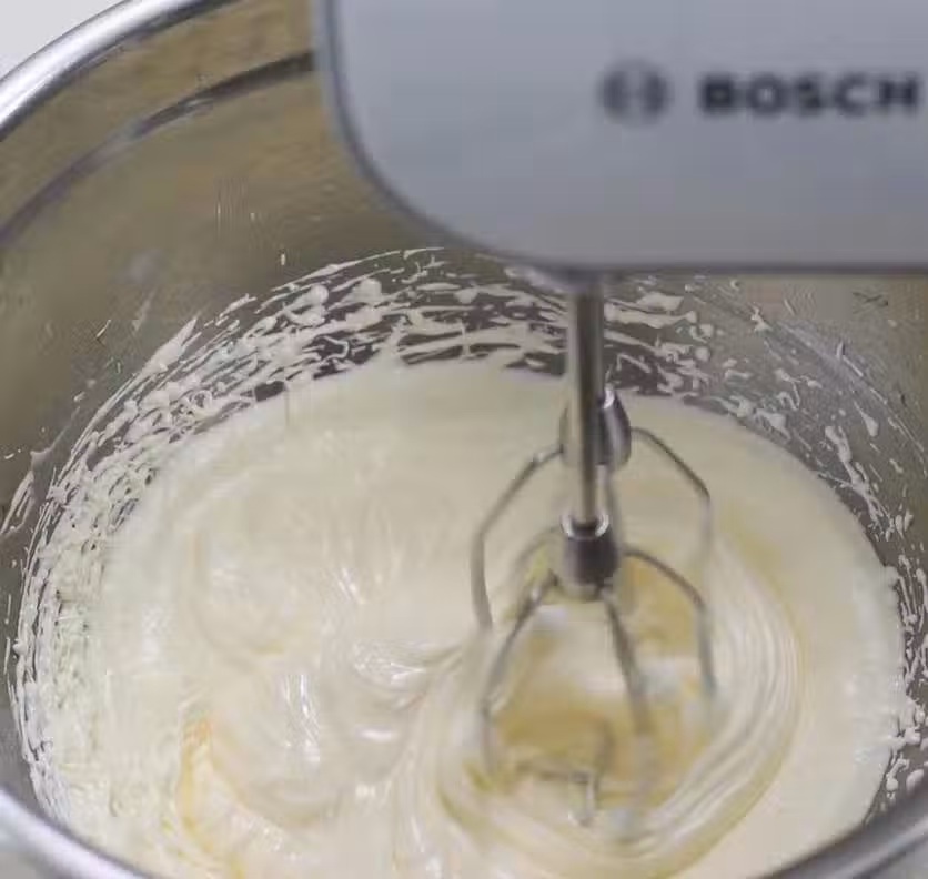 用打蛋器攪打至完全融合,質地細膩,富有光澤。