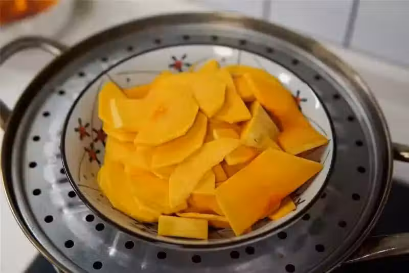 小貼士:南瓜片切得比較厚的話,可以延長蒸製的時間,用筷子輕輕的可以扎透南瓜片,就說明南瓜片蒸熟了。