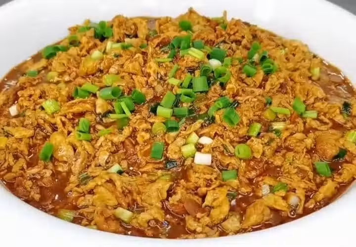 4、鍋開以後煮個兩三分鐘,煮至湯汁濃稠,放入少許的白糖給它提鮮,最後,再放入一把蔥花給翻炒均勻即可出鍋裝盤。無論是拌麵條還是拌米飯,沾青菜都不錯。