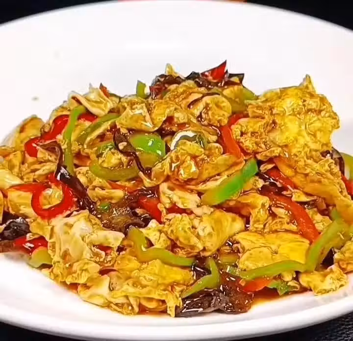 鍋中再加少許的底油,蔥花爆香,倒入青紅椒、木耳絲,大火翻炒一分鐘,再倒入攤好的雞蛋,事先調好的料汁,大夥翻炒均勻,出鍋裝盤就可以了。