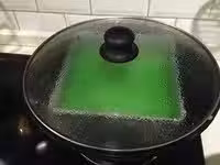 6、然後倒入100ml的白色麵糊,同樣用勺子弄平,使之覆蓋住下麵綠色這層。蓋上蓋子蒸3分鐘左右直至凝固。然後交替的用同樣方法,一層綠色,一層白色地蒸,直至用完所有麵糊,正好是9層。