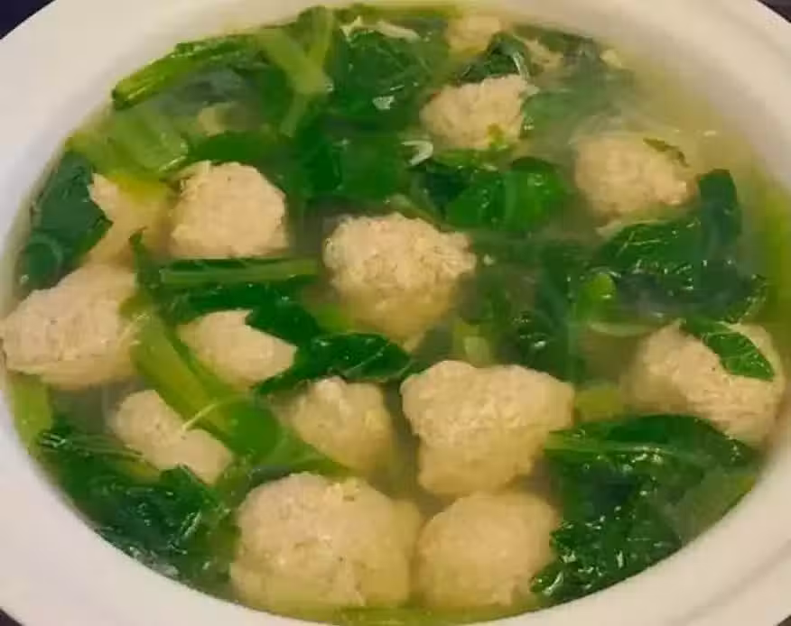 5、開大火將丸子煮至浮起(丸子煮至浮起,丸子即是熟了)放入小白菜,燒開,煮至小白菜顏色變深即可,加入鹽調味,關火,加入白鬍椒粉、香油攪拌均勻,盛出即可。