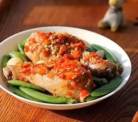 原料:雞腿2個、荷蘭豆1把、剁椒1大勺、姜1塊、蒜5瓣、海鮮醬1小勺、生抽1小勺、料酒1小勺、胡椒粉1小勺、食鹽1小勺。