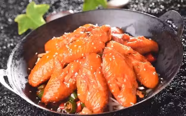 3.取一平底鍋,鍋中不放一滴油,將雞翅膀正面向下平鋪在鍋底,放火上小火加熱。