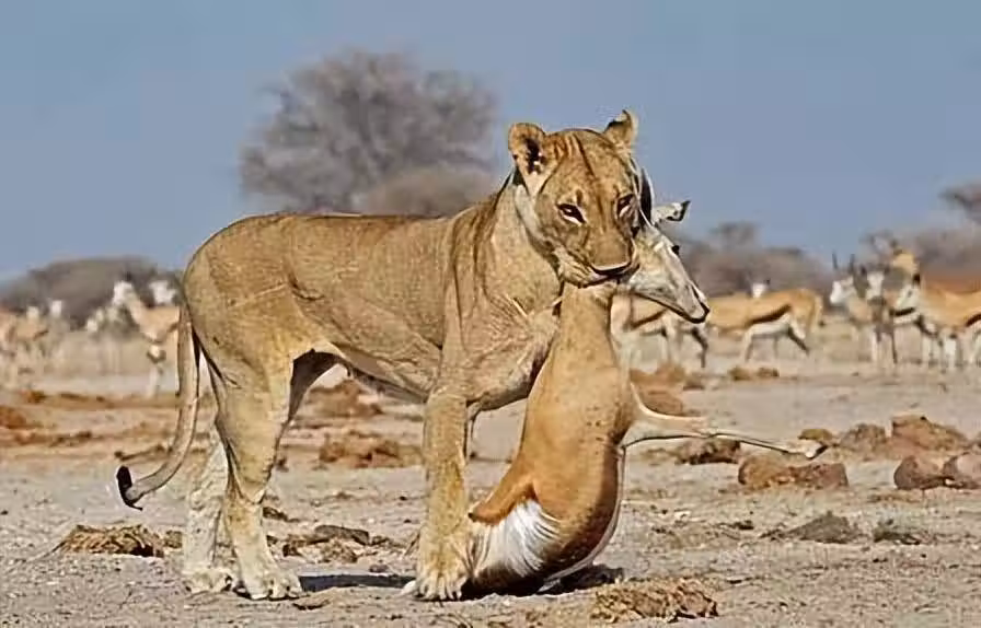 母獅殺死了一隻羚羊。在獅群中,母獅負責打獵,雄獅負責巡邏、守護領地。當然,這不是絕對的。