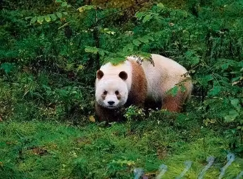 非常罕見的棕白色大貓熊。有人笑稱:「印表機沒墨了,打出了一隻掉色的大貓熊。」