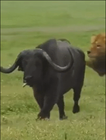 雄獅的體型看上去和水牛差不多,要單槍匹馬放到一頭壯碩的水牛,可真不是一件容易的事兒!一不小心,獅子柔軟的腹部就會被可怕的牛角刺穿!