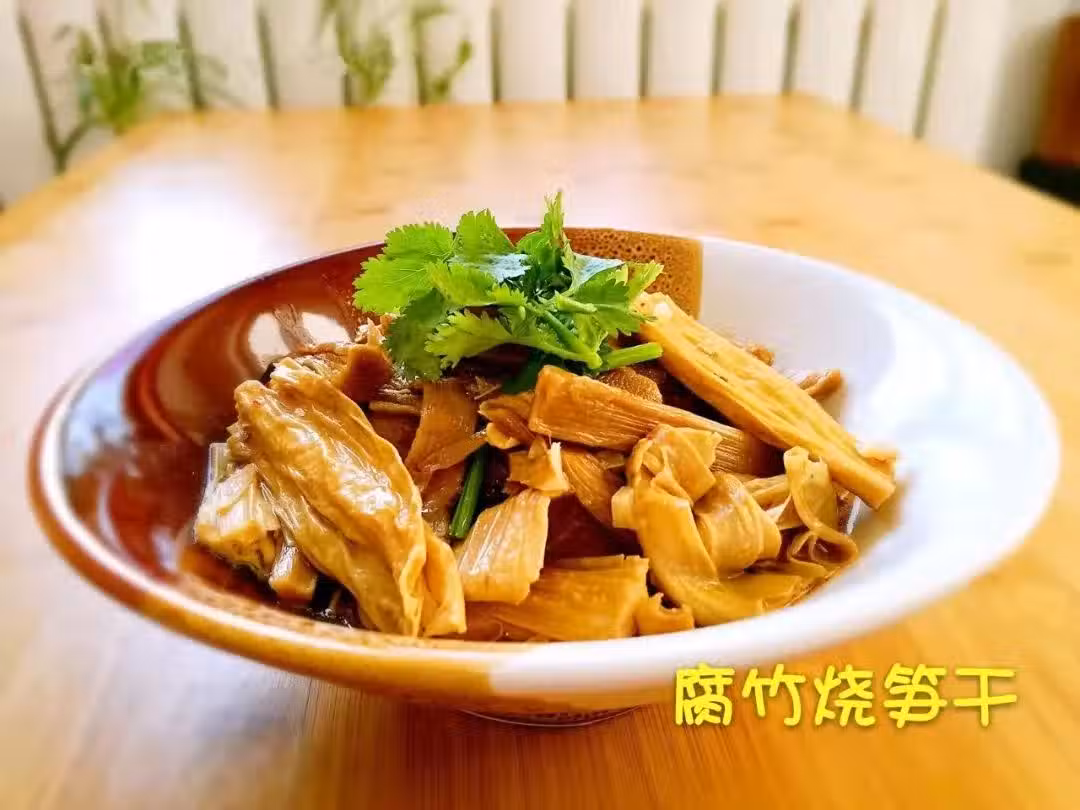 干腐竹100克,筍乾100克,油辣椒一小勺,鹽,素高湯,金蘭素蚝油,香菜,八角一個,花椒,薑末