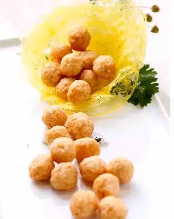 3、將打好的餡料擠成大小均勻的丸子入鍋炸熟至金黃出鍋裝盤既可。