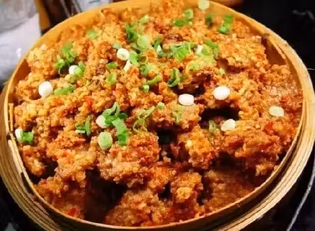 食材:排骨1斤、粉蒸米粉100g、老抽、蚝油、白酒、蔥姜、