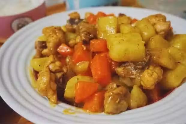 3、然後倒入土豆塊,翻炒幾下把融化的咖喱裹在土豆上;再加適量的水,大火燒開後,改小火燜煮,大概燒10分鐘這樣後,加少許鹽。