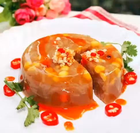 9)把豬皮凍趁熱倒入耐熱的容器中,放涼後入冰箱保存即可!食時取出切丁或者切片都可以!