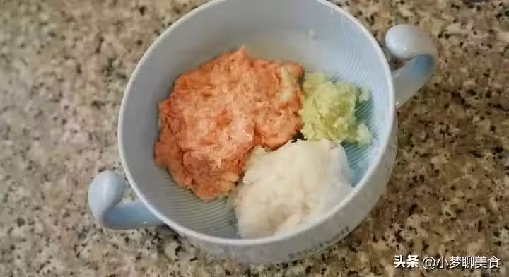 做法:豬肉沫+鱈魚沫加料酒去腥,打入雞蛋,攪拌上勁。白菜切碎加鹽擠水。生抽+鹽+香油混合。