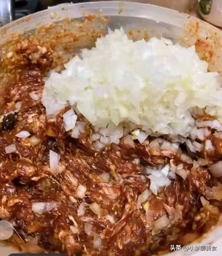 做法:牛裡脊剁碎+豬肉+雞蛋,分次加蔥姜水攪拌上勁,洋蔥切碎。生抽+老抽+胡椒粉+鹽若有食材混合。