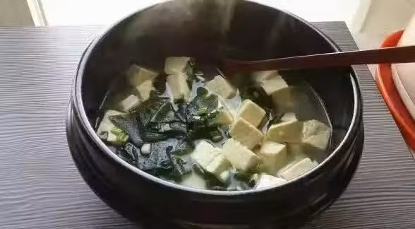 4.大火燒開後轉小火,將海帶片放入湯中。