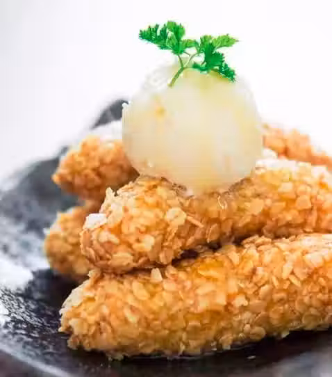 當油足夠熱後,將香蕉炸至金黃,然後轉移到食用級矽油紙上冷卻,裝盤。
