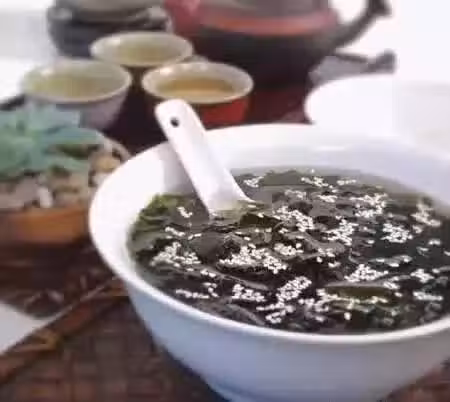 2、湯煮沸後放入海帶芽煮開,加入所有調味料,調好鹹淡味道,起鍋前灑上白芝麻即可。