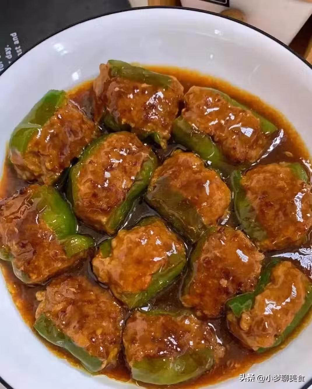 ③青椒切斷去芯,青椒塞去肉末,放入平底鍋煎出虎皮,倒入醬汁燜煮收汁。