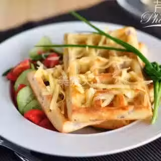 7、小黃瓜1根,聖女果適量,小香蔥一根,鹽少許,糖少許,黑胡椒粉少許,色拉油少許,葡萄醋適量,拌成沙拉,(或者自己喜歡的任意蔬菜沙拉,拌出自己喜歡的合適口味)與華夫餅一起擺盤上桌!