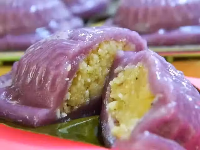 3)把麵糰平均分割。搓成圓形,壓扁後包入椰絲餡後再搓圓放入塗上少許糯米粉的模型里印出形狀。把糕放在一小片塗上少許油的香蕉葉上。