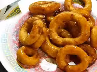 4)把鍋開熱,加入油,把番薯圈炸成金黃色勞起 趁熱灑上細紗糖便可