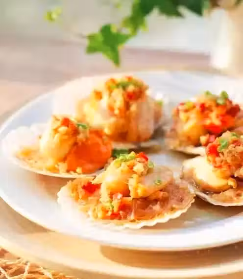 3、將剖出的扇貝肉放在粉絲上,每隻均勻地倒入少許黃酒,鋪上調好的蒜蓉;