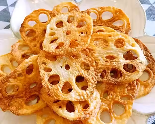 2. 將它放在太陽下曬 1 小時後,用刨刀將蓮藕段刨成薄片,直入熱鍋中,中火炸至金黃色。(間中攪拌,避免相黏)