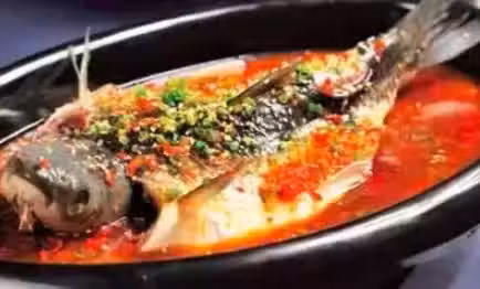 3、起鍋將油燒至五成熱,下入青紅辣椒碎50克、番茄醬20克、鹽3克、味精2克熬成湯汁,澆在草魚上即可,上面撒蔥花20克。