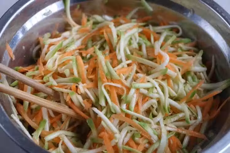 2、西葫蘆、胡蘿卜腌漬出的水分擠掉,放入泡發好的木耳絲、雞蛋碎,小蔥碎;